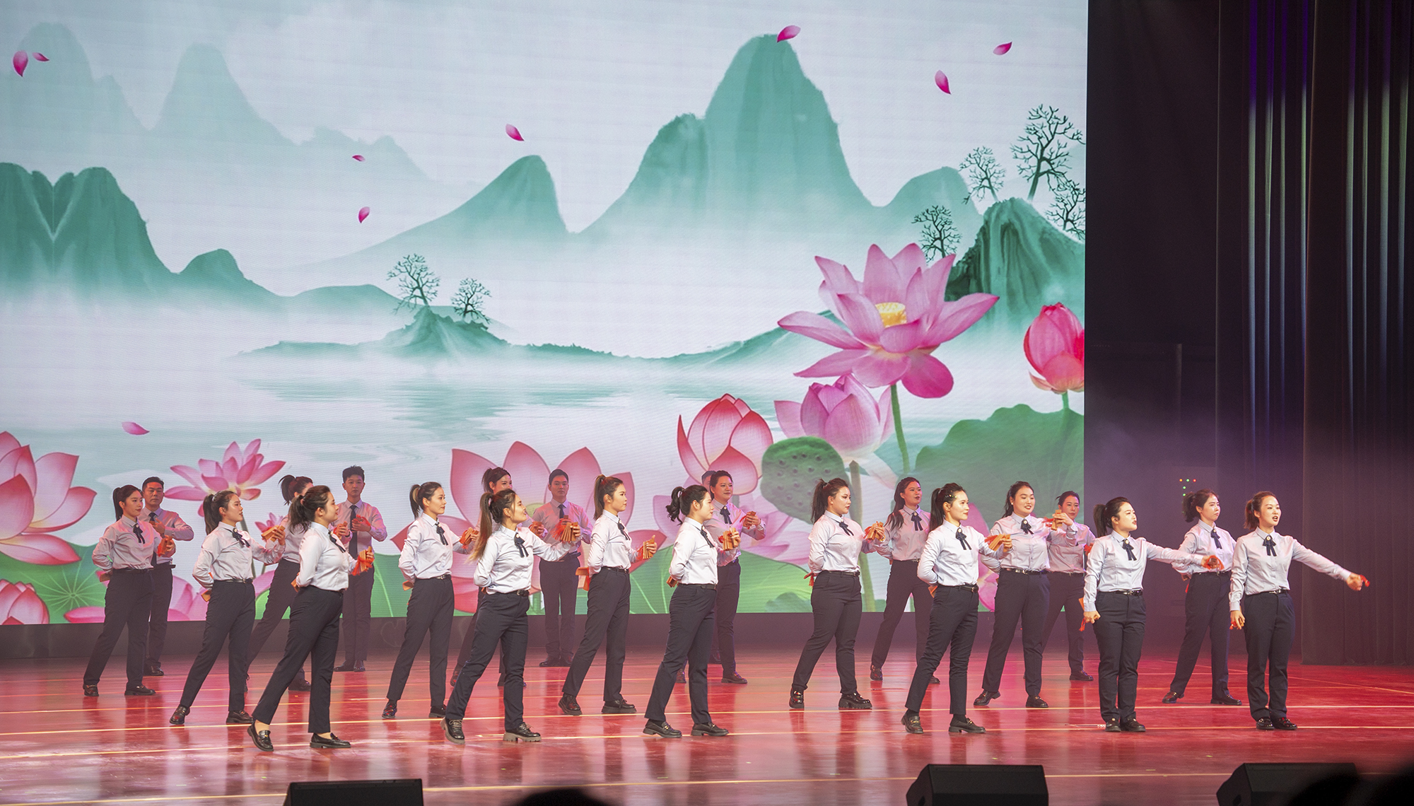 晚會緊扣“二十周年”主題,立足集團發(fā)展實際,由干部職工自主策劃、原創(chuàng)編排、親自演繹,精心呈現(xiàn)了情景朗誦、歌舞表演、合唱等多種藝術形式,既回溯了集團創(chuàng)業(yè)初期的艱辛與堅守,也生動展現(xiàn)了新時代背景下國投集團改革轉型、創(chuàng)新發(fā)展的昂揚姿態(tài)。節(jié)目三句半《國投駿馬奔新程》以生動鮮活的表達方式,濃縮呈現(xiàn)集團二十年改革發(fā)展、實干擔當?shù)膴^斗足跡,引發(fā)觀眾強烈共鳴。戲曲對唱《武家坡》唱腔婉轉、韻味悠長,將傳統(tǒng)藝術與時代主題巧妙融合;情景劇《停車奇遇記》取材身邊、貼近實際,通過細膩演繹展現(xiàn)國投人在日常工作中服務群眾、擔當作為的精神風貌;AI《數(shù)字人》以科技賦能舞臺表現(xiàn),生動展現(xiàn)集團在數(shù)字化轉型和創(chuàng)新發(fā)展方面的積極探索。演員們真摯投入的演繹,引發(fā)現(xiàn)場觀眾交口稱贊,掌聲此起彼伏,將晚會氣氛一次次推向高潮。